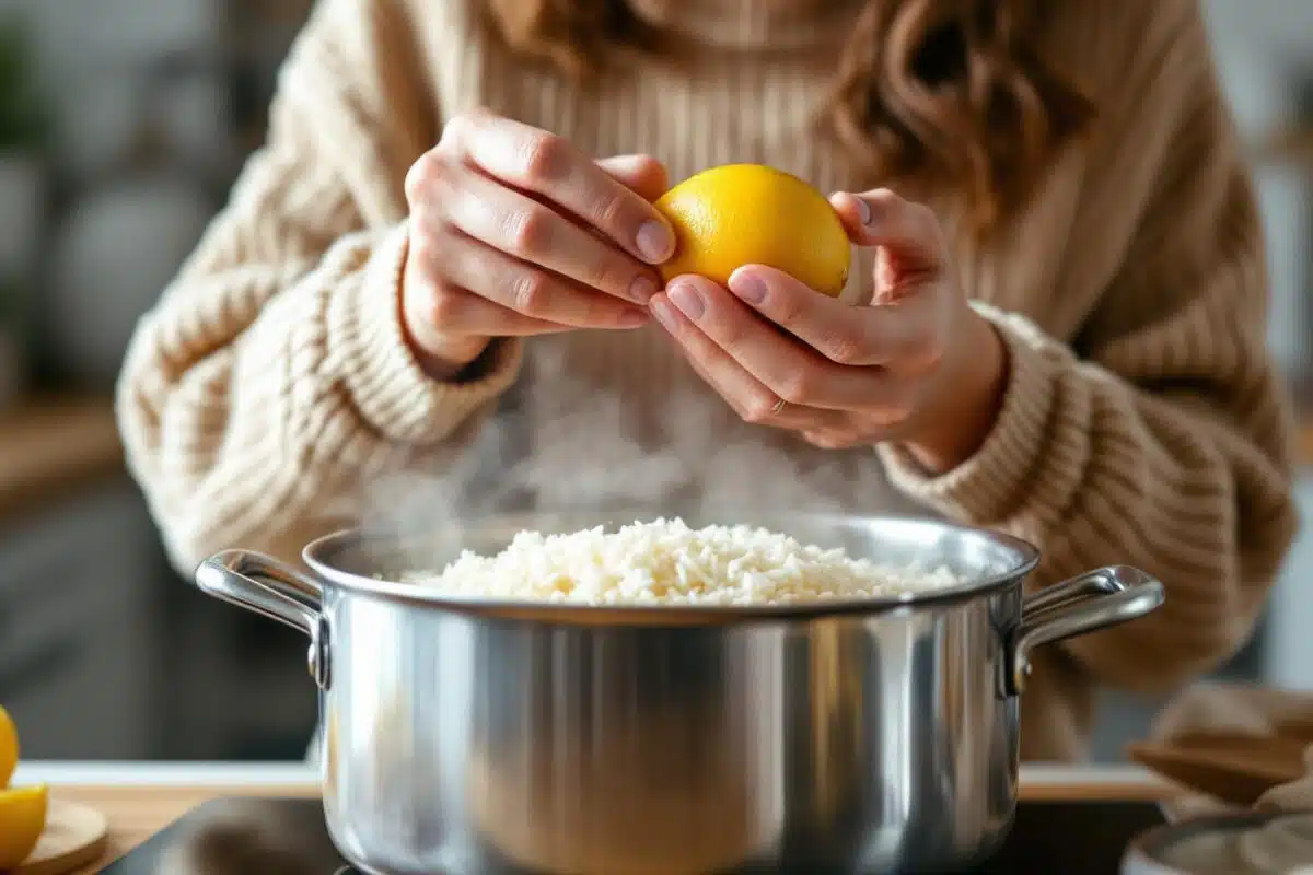À chaque litre d’eau de cuisson, comptez environ une cuillère à soupe de jus de citron (ou de vinaigre de cidre/d’alcool doux). Le geste s’effectue au moment où l’eau bout, avant de verser le riz, ou juste après l’avoir ajouté. L’acidité pénètre alors au cœur des grains pour agir tout au long de la cuisson. Rien n’empêche d’opter pour le citron en hiver, lorsque les agrumes sont abondants et économiques sur les étals.