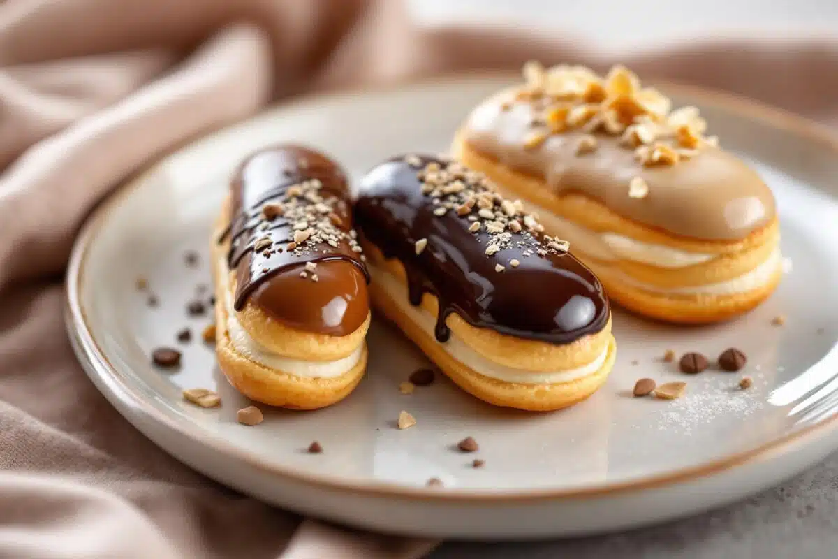 Pour le glaçage chocolat, faire fondre le chocolat avec le lait végétal, laisser tiédir puis plonger le dessus de l’éclair. Pour le café, mélanger fondant pâtissier ou sucre glace avec du café fort, et napper généreusement. Pour la vanille, créer un glaçage blanc avec sucre glace et quelques gouttes d’eau, à déposer en fine couche pour la touche élégante.