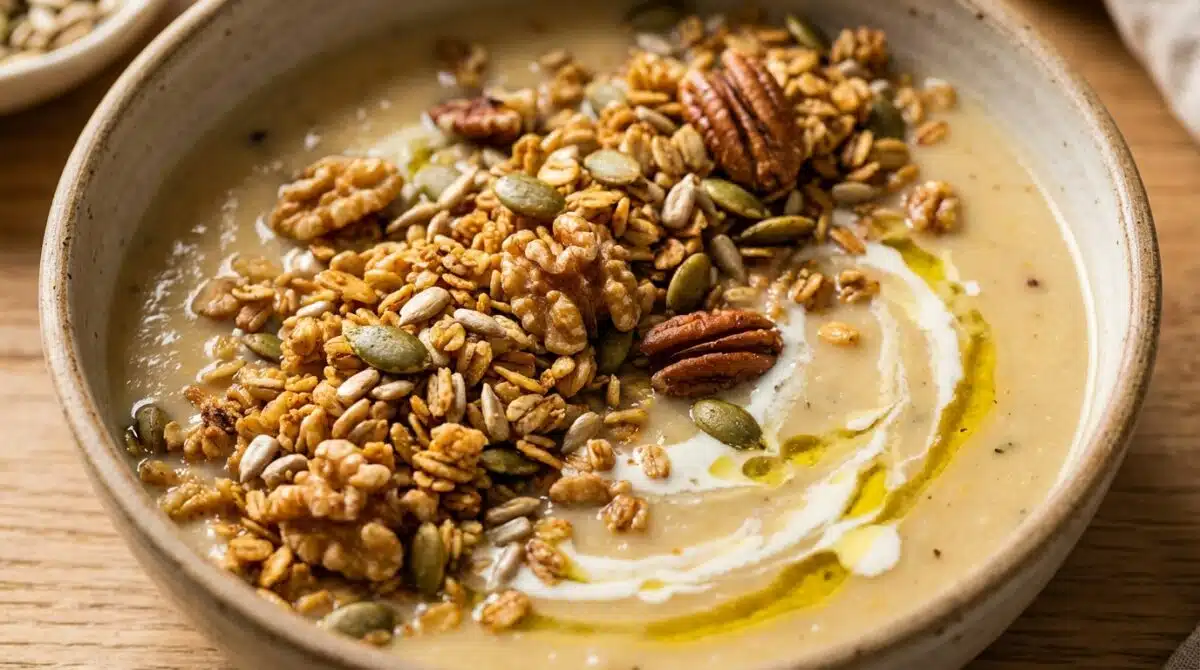 La réussite de cette recette réside dans la simplicité de son exécution. Le principe est universel et infaillible pour toutes vos bases : mélangez flocons d’avoine, graines variées, épices et huile d’olive, puis faites dorer 20 minutes au four pour obtenir un granola salé croustillant, idéal à grignoter ou à saupoudrer sur soupes et salades. Pour cette version rustique, commencez par réunir les flocons, le sarrasin et les graines de courge dans un grand saladier. Le sarrasin apporte une incroyable texture sablée qui contraste merveilleusement avec l’onctuosité des soupes.