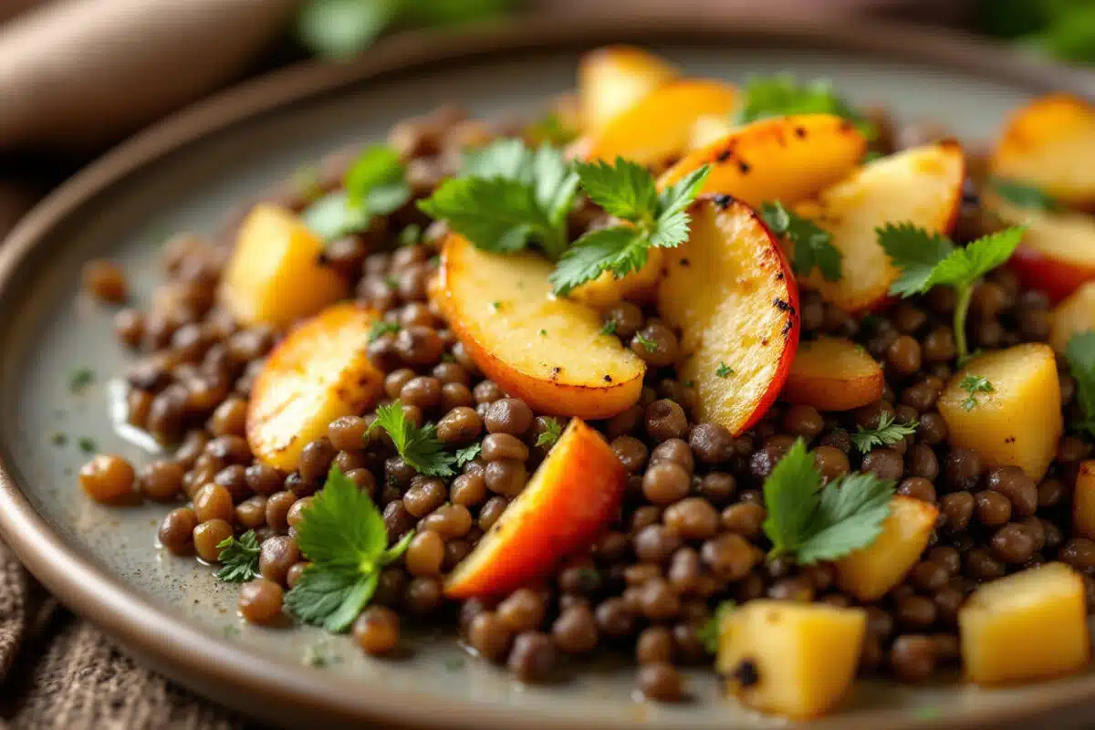 Ce mariage de légumineuses et de fruits de saison s’adapte à toutes les envies. En version entièrement vegan, misez sur les noix pour un supplément de gourmandise. Les adeptes de parfums plus prononcés peuvent glisser un soupçon de piment d’Espelette ou de cumin dans les lentilles, ou parsemer de zeste d’orange râpé. Et pour ceux qui souhaitent une note plus « bistrot », pourquoi ne pas ajouter du fromage végétal râpé ou émietté ?